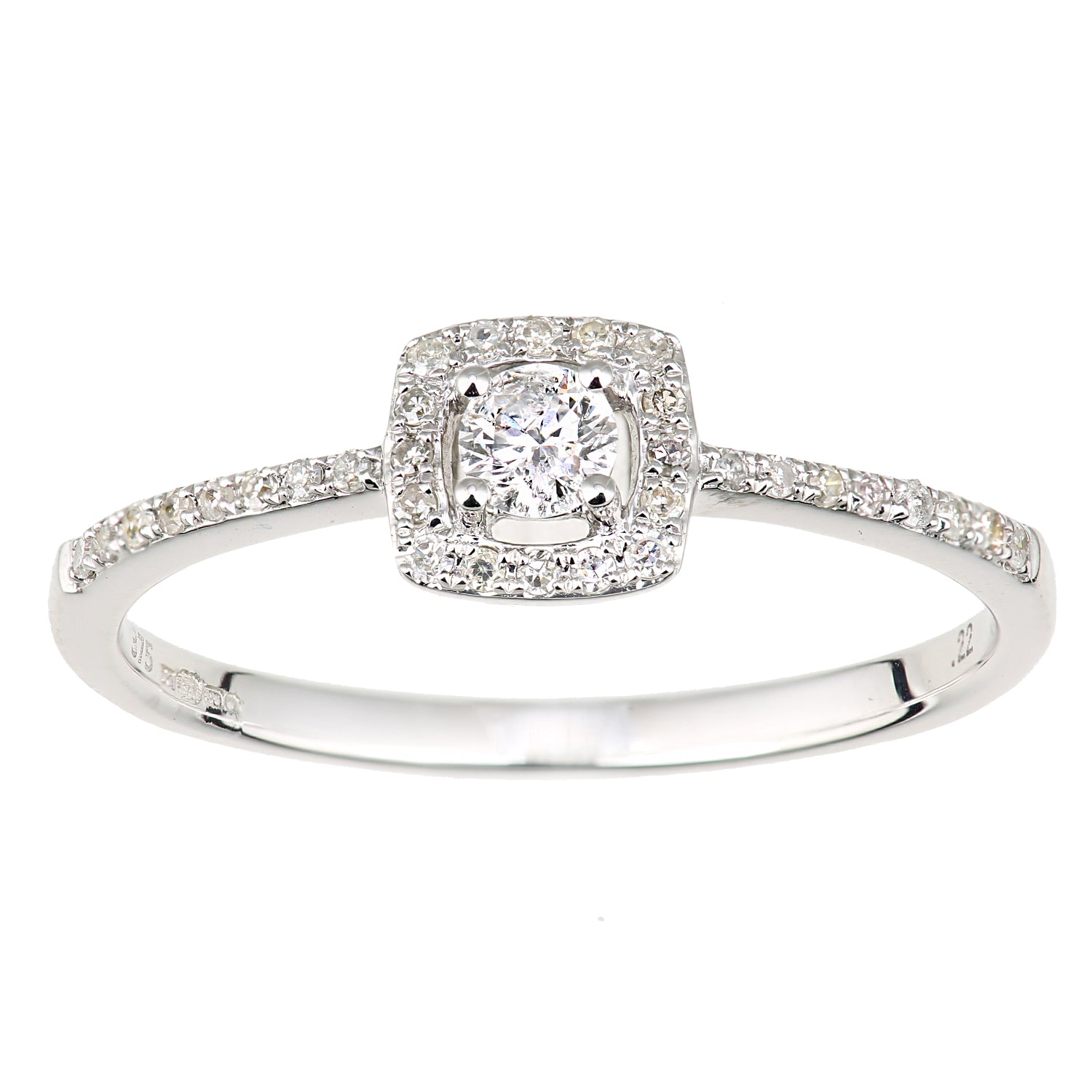 0.22ct Round Diamond Prong Set Square Halo Engagement Ring with Side Stones in UK Hallmarked 9ct White Gold