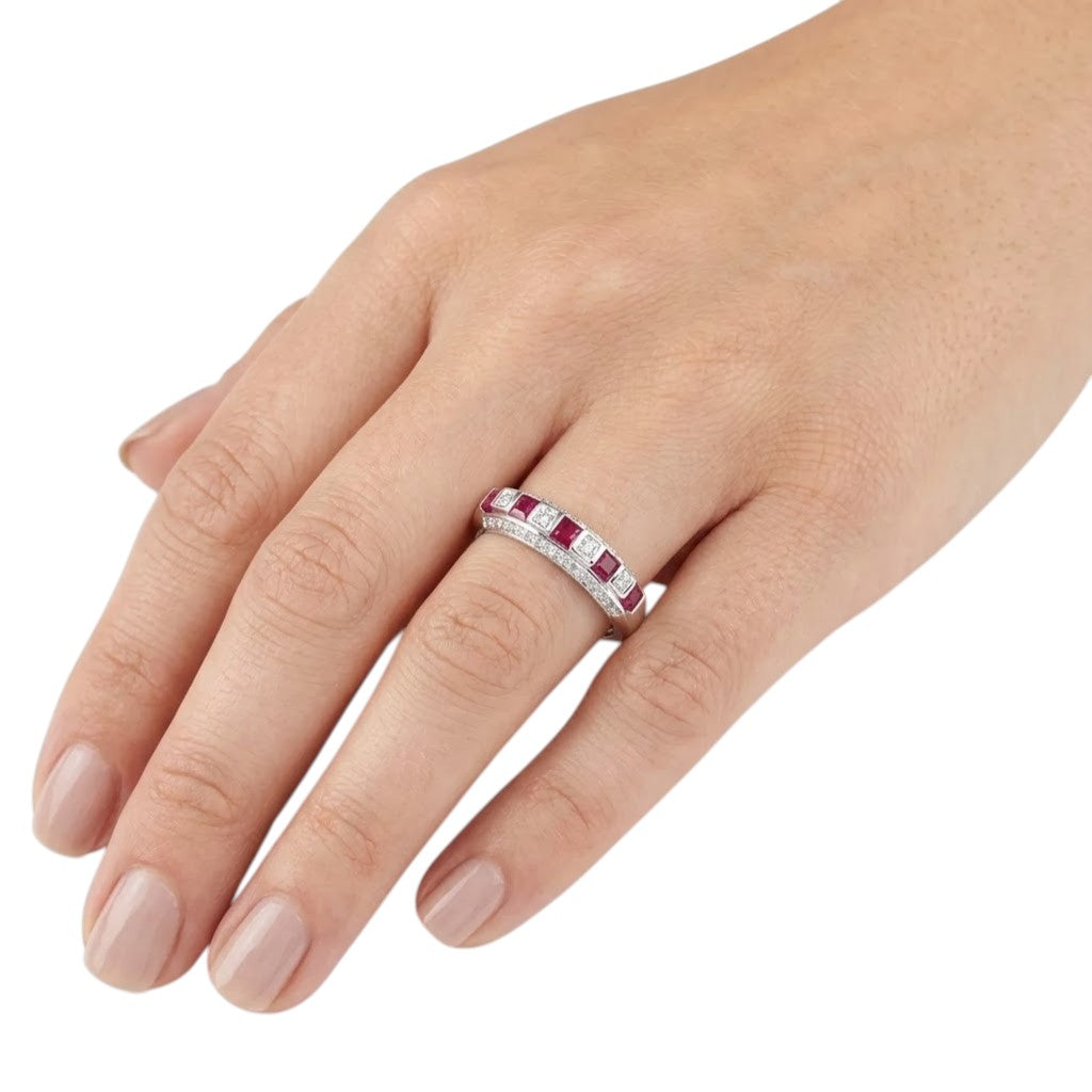 Add timeless elegance and vibrant colour to your jewellery collection with this stunning 0.53ct Square Ruby and 0.10ct Round Diamond Pave Set Half Eternity Ring in 9ct White Gold. This beautifully crafted ring features rich square-cut rubies complemented by sparkling round brilliant-cut diamonds in a delicate pave setting, creating a refined balance of colour and brilliance.