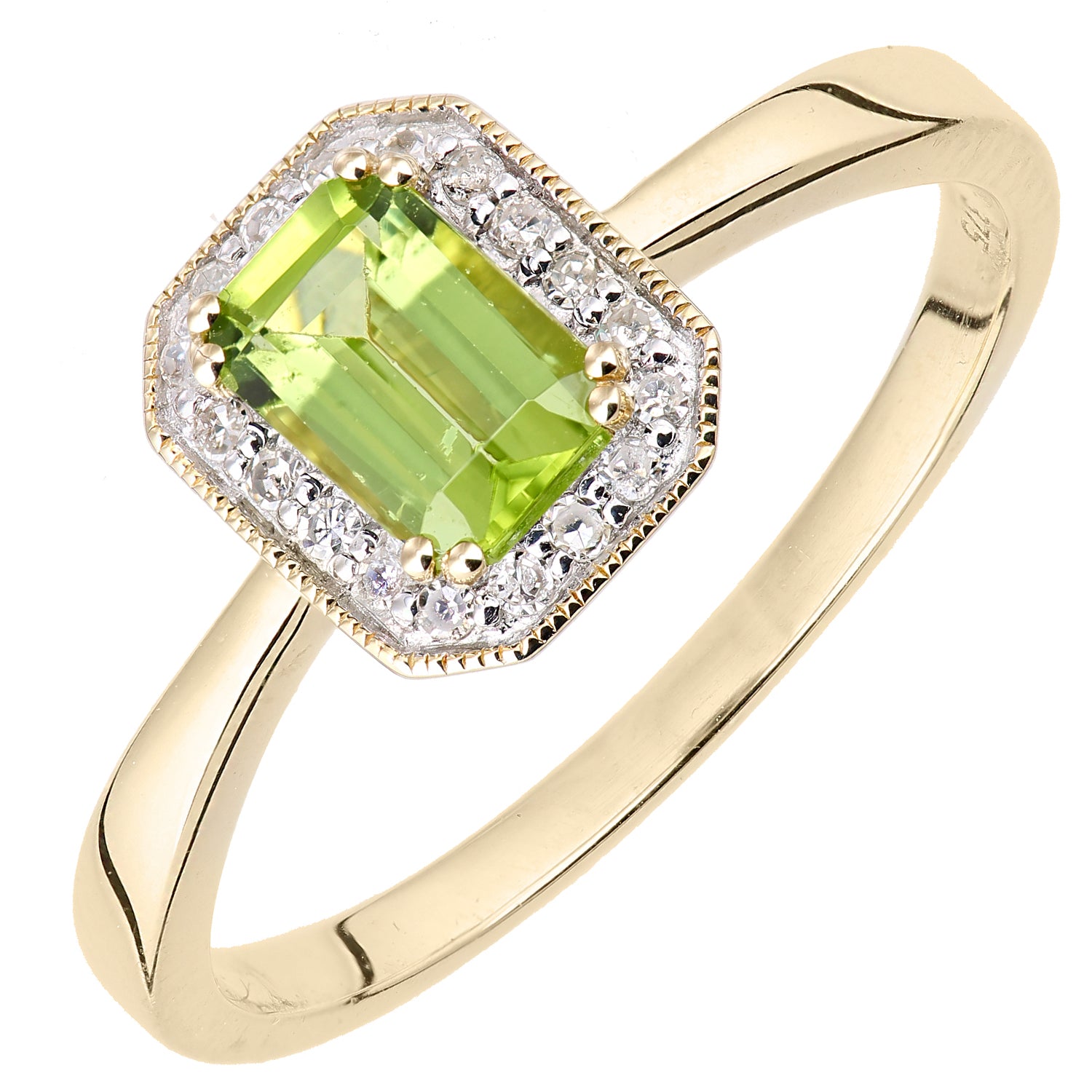 0.58ct Octagonal Peridot and Round Diamond Cluster Ring in UK Hallmarked 9ct Yellow Gold