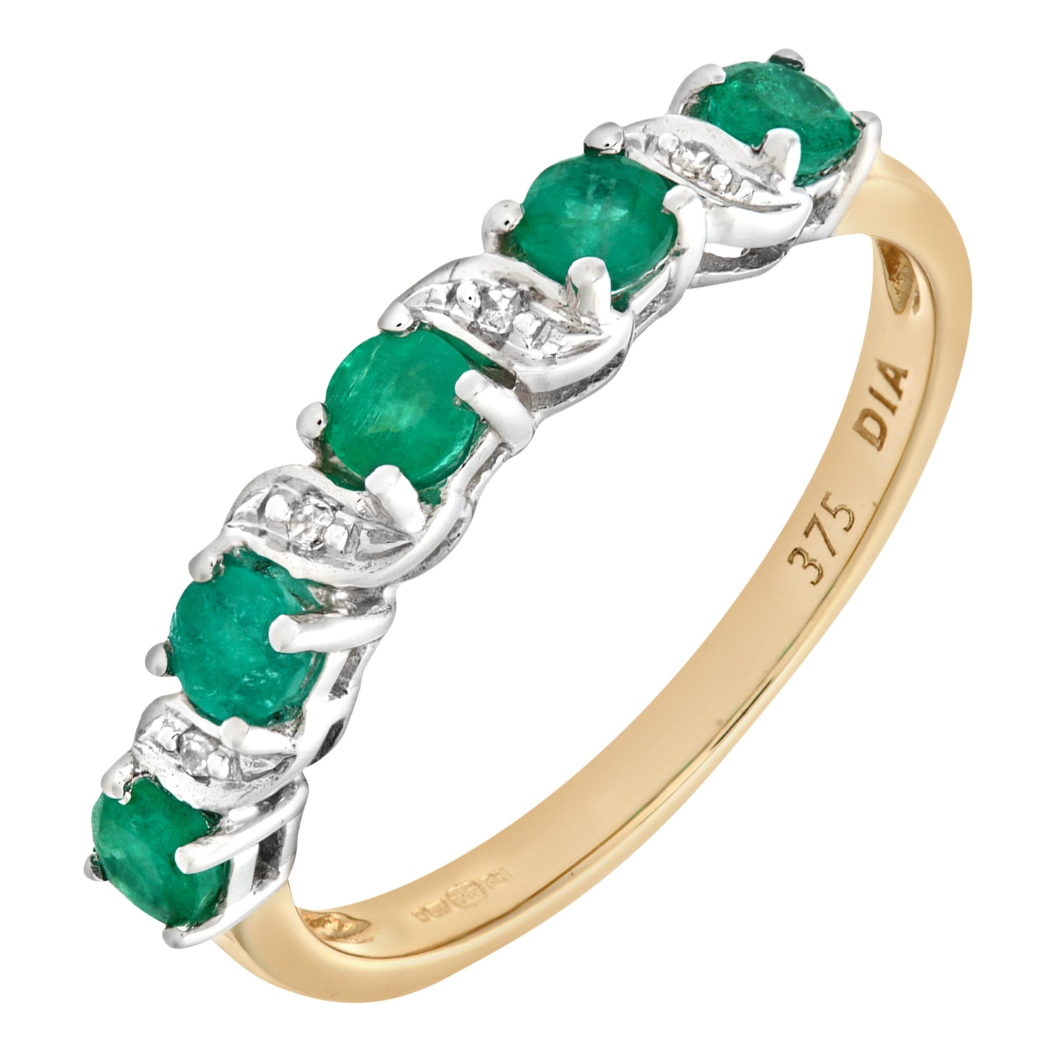 0.63ct Prong Set Emerald and Diamond Pave 5 Stone Ring in UK Hallmarked 9ct Yellow Gold
