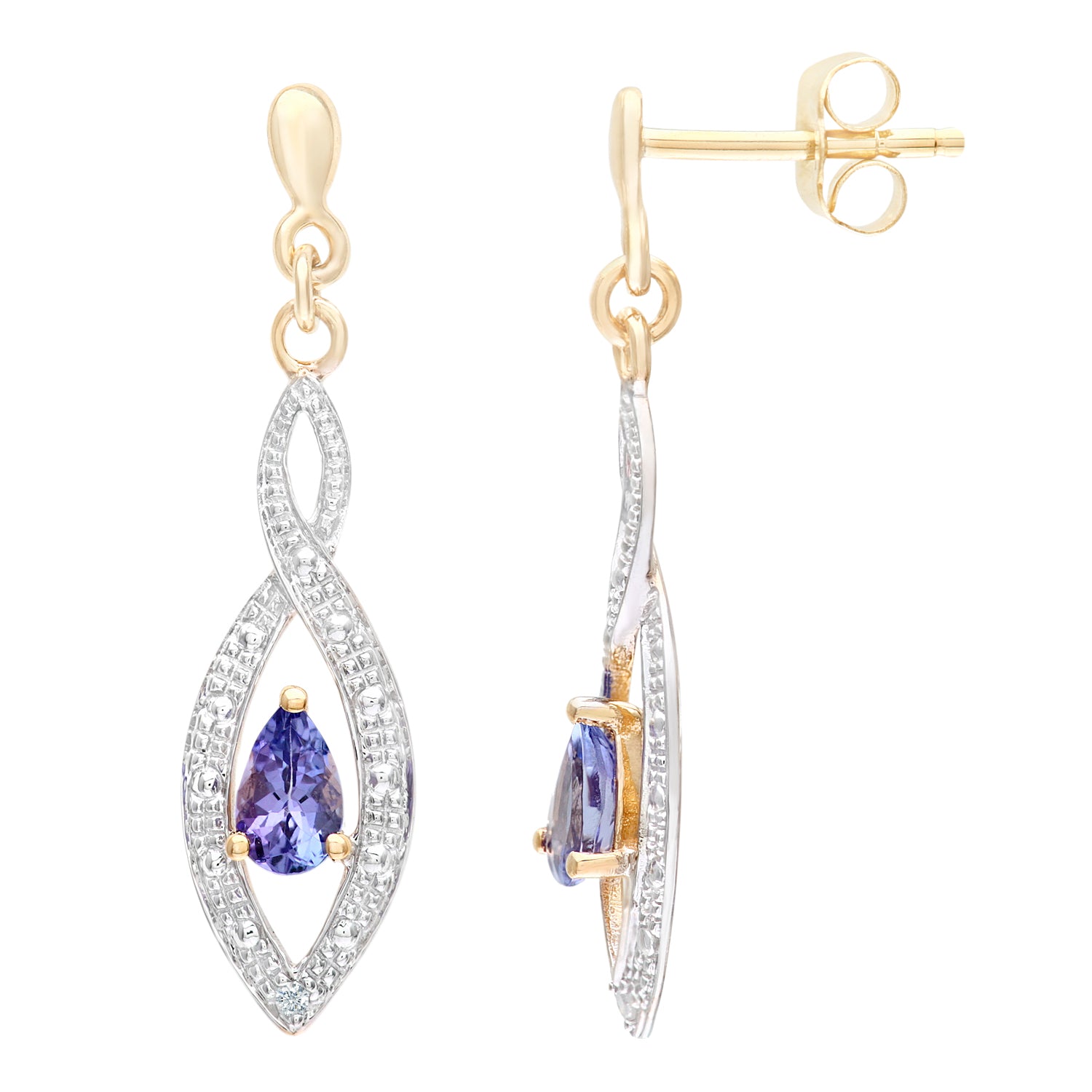 0.9ct Pear Shape Tanzanite and Pave Set Diamond Drop Earrings in 9ct Yellow Gold