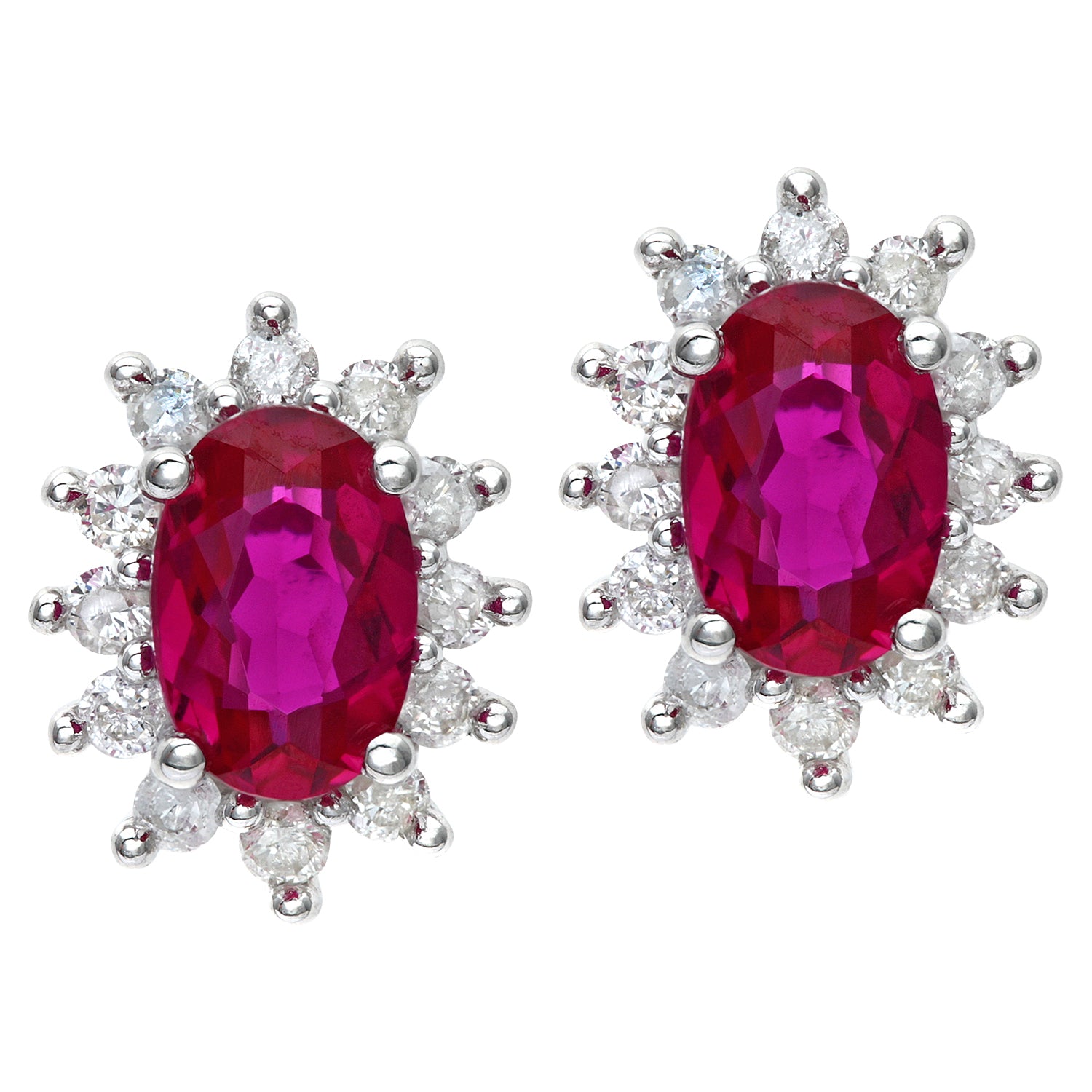 1.21ct Oval Ruby and 0.25ct Round Diamond Stud Cluster Earrings in 9ct White Gold