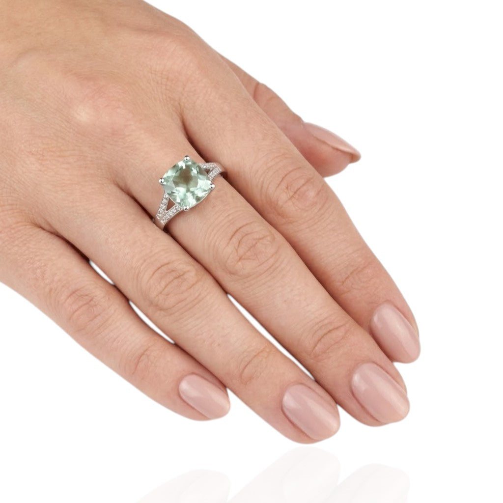 Make a statement with this 2.1ct round claw-set green amethyst and diamond ring, crafted in UK hallmarked 9ct white gold. The soft green amethyst is beautifully secured in a classic claw setting and enhanced by sparkling diamond accents, creating a fresh and elegant look. Perfect for special occasions or as a standout everyday piece, this ring combines subtle colour, refined craftsmanship, and lasting brilliance. Shop now to add a touch of modern elegance and luxury to your jewellery collection.