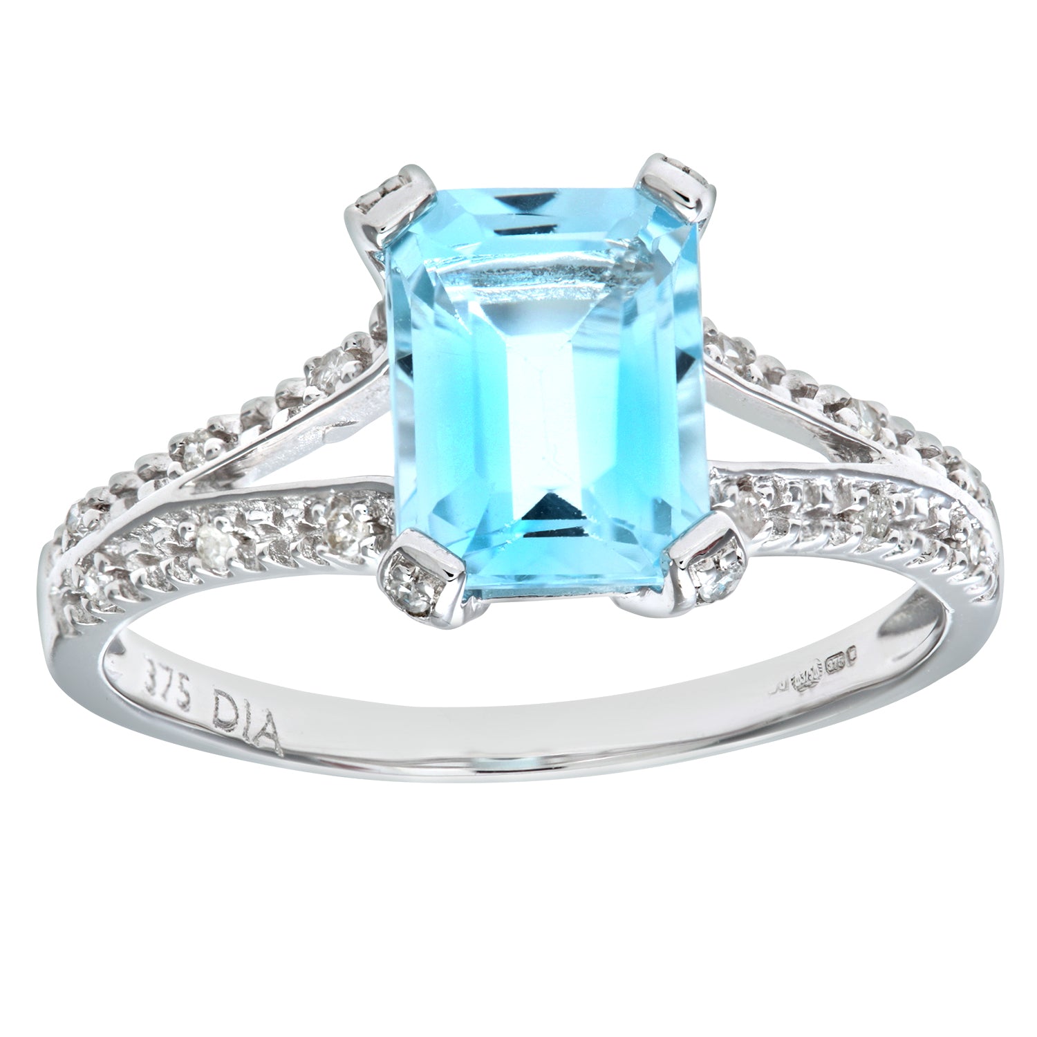 2ct Blue Topaz Emerald Cut Solitaire Split Shoulder Ring with Pave Set Side Stones in UK Hallmarked 9ct White Gold