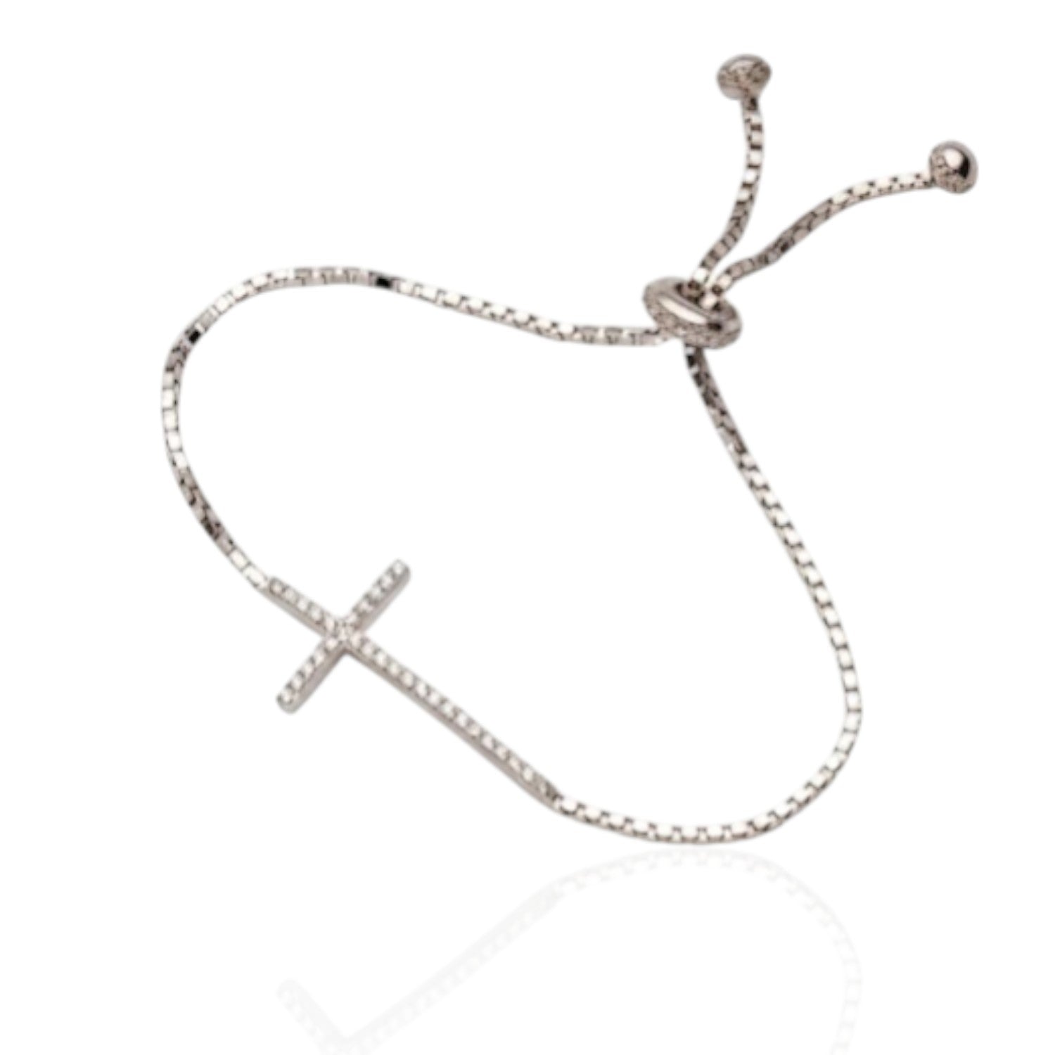 The adjustable toggle or slider closure ensures a perfect fit for any wrist size, making it practical for everyday wear. The brilliant CZ stones provide a radiant, diamond-like sparkle, creating a versatile accessory suitable for casual, formal, or religious occasions.