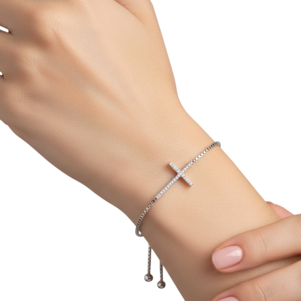 Add a meaningful and stylish touch to your jewelry collection with this cross design bracelet crafted from 925 sterling silver. Featuring sparkling CZ (Cubic Zirconia) stones, this toggle/slider bracelet combines faith, elegance, and adjustable comfort.