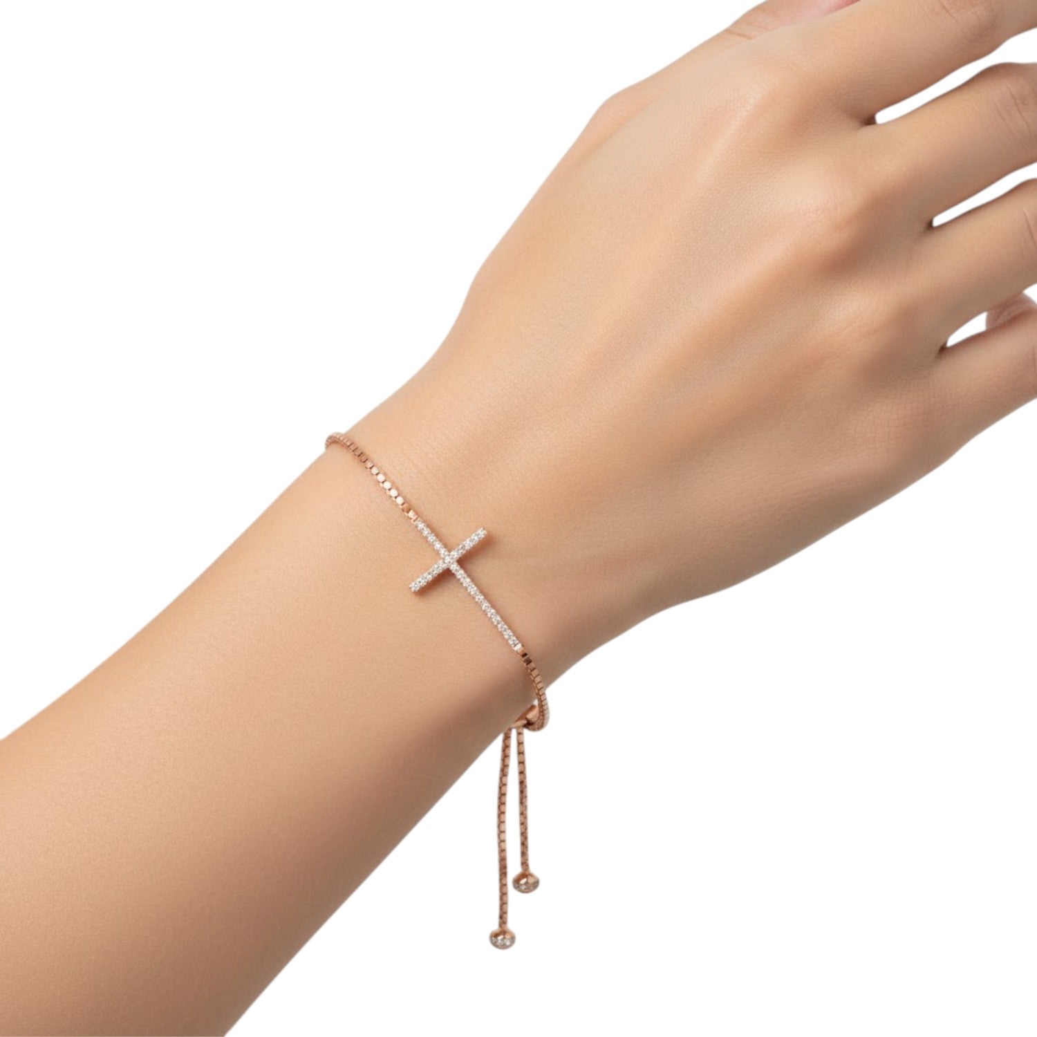 Add elegance and meaning to your look with this cross design bracelet crafted from 925 sterling silver and finished in a beautiful rose gold colour. Adorned with sparkling CZ (Cubic Zirconia) stones, this toggle/slider bracelet combines style, faith, and adjustable comfort.