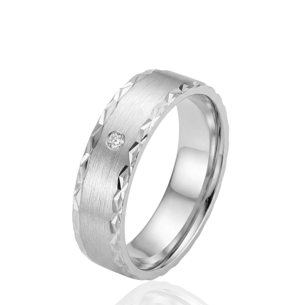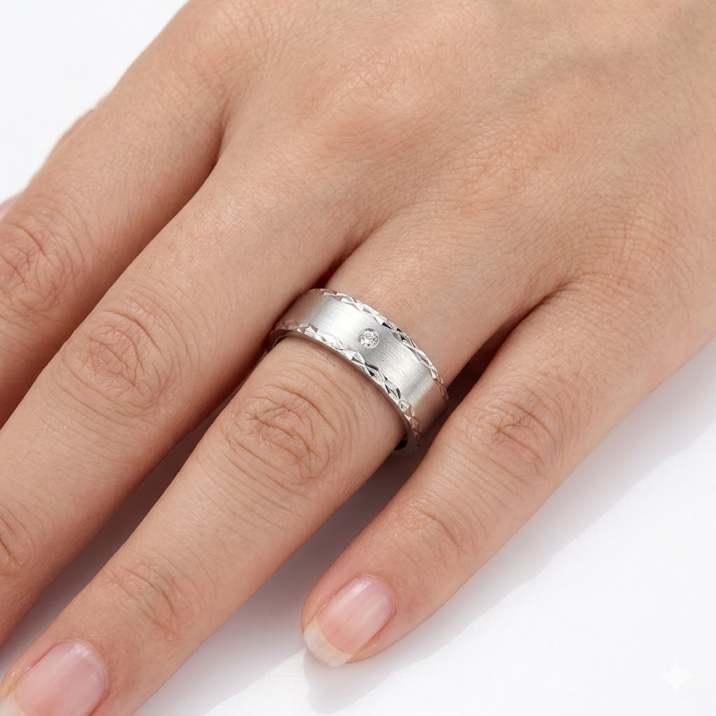 Elevate your style with this modern 5.5mm wedding ring featuring a sleek flat shape, intricate pattern, and sparkling CZ stones. Designed with a matt finish and polished faceted edges, this wedding band combines contemporary elegance with eye-catching detail.