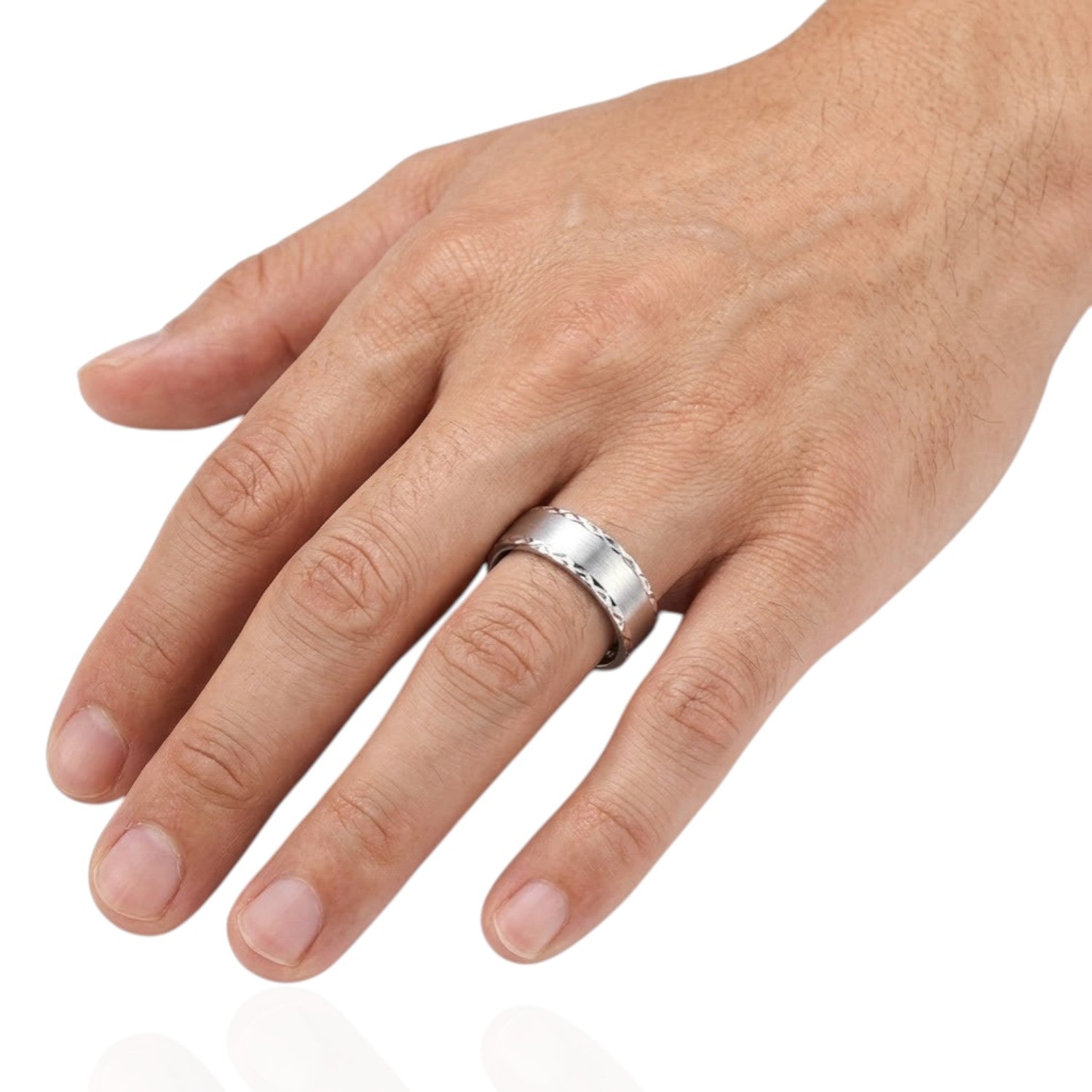 The combination of matt texture and polished edges creates a striking contrast, giving the ring a unique contemporary style while maintaining a classic appeal. Ideal as a standalone piece or paired with an engagement ring, this flat-shaped wedding band symbolizes love, commitment, and enduring style.