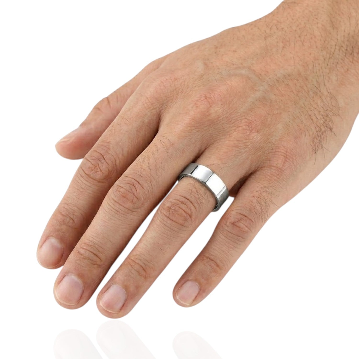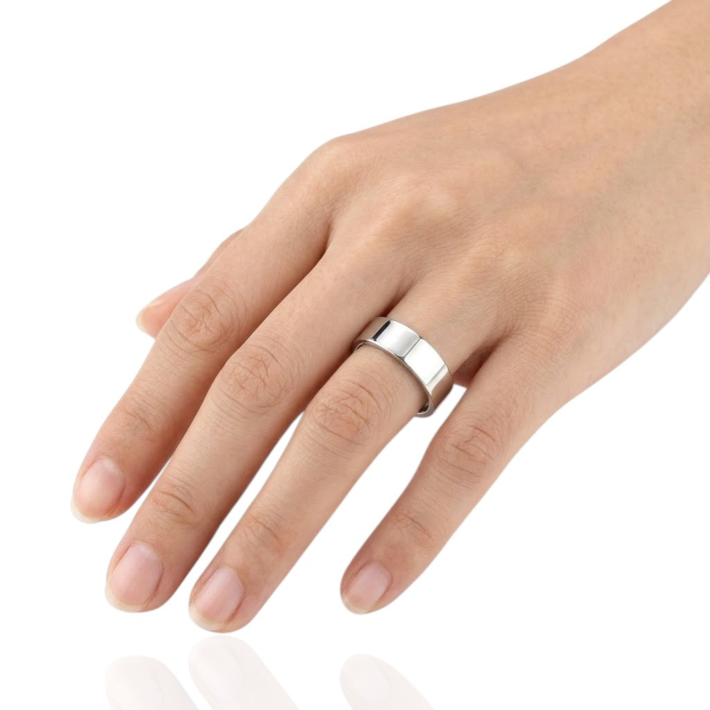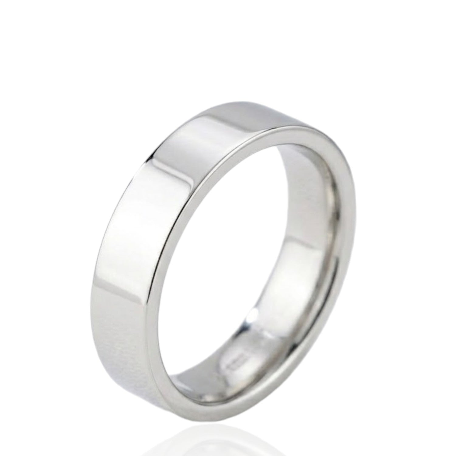 The contemporary flat shape combined with unique pattern details creates a timeless look that stands out from traditional bands. Durable and stylish, this wedding ring symbolizes love, commitment, and sophistication, making it a meaningful gift or a perfect addition to your personal jewelry collection.